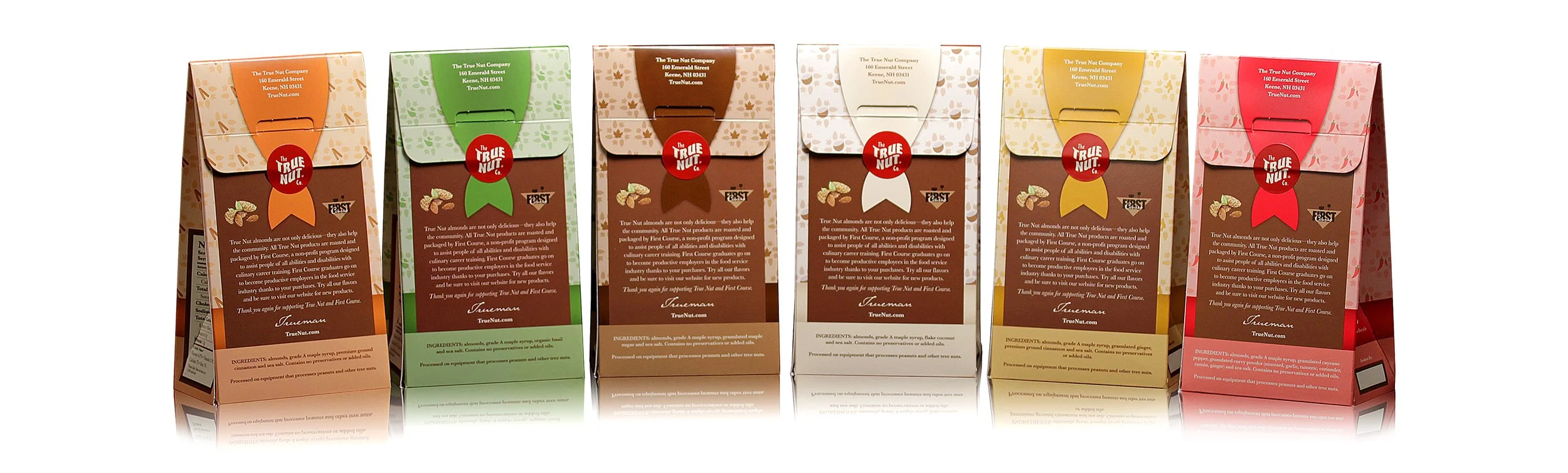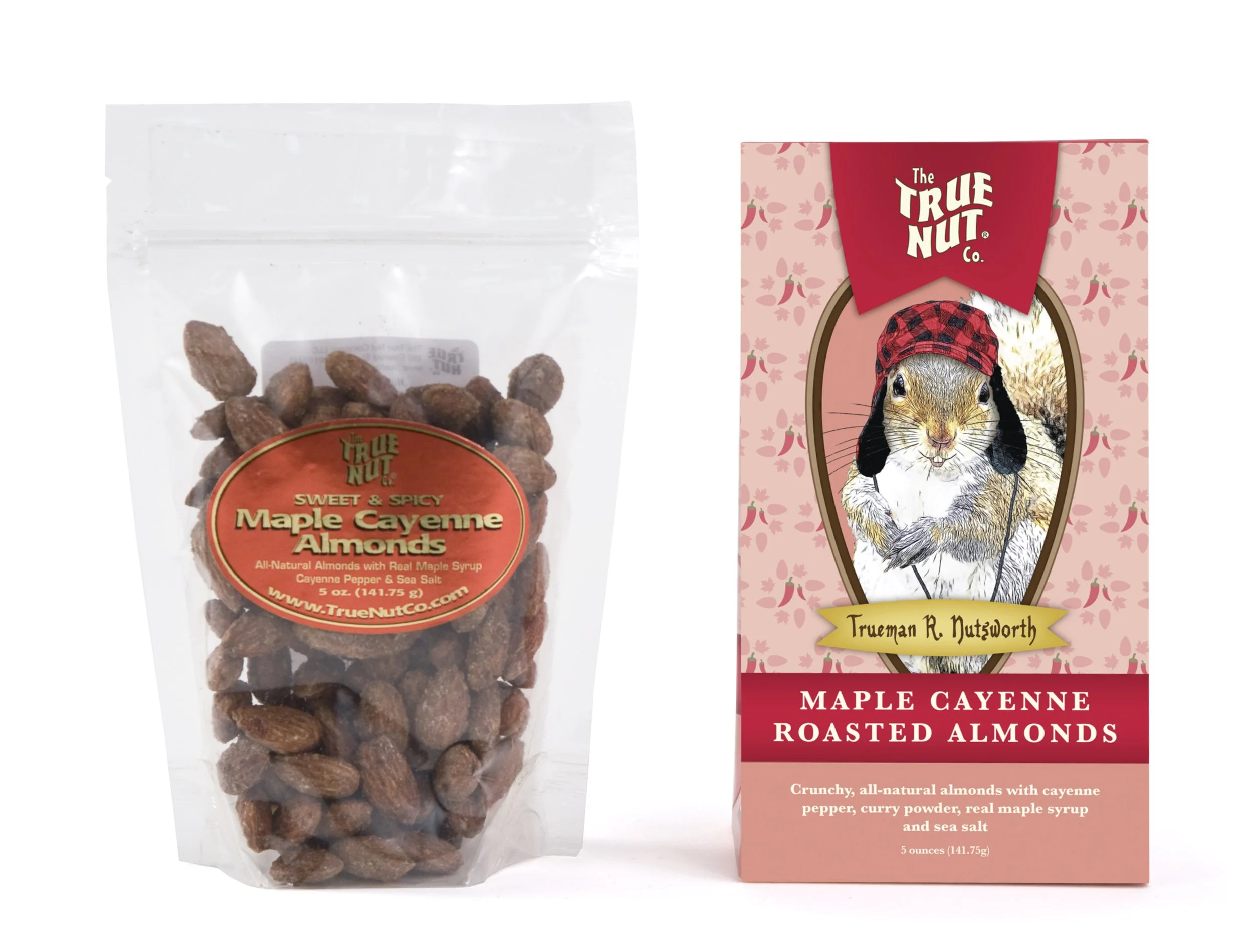 The director of marketing came up with the idea of a mascot: Trueman Nutsworth, a friendly squirrel from the woods of New Hampshire that wears a buffalo plaid hat. I was tasked with illustrating the character and designing the packaging for 6 flavors of maple roasted almonds.